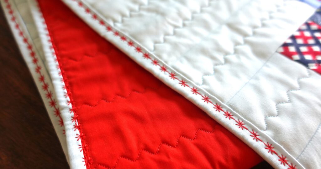 My Baby Lock Ballad sewing machine was ready to go on this project! I decided to use a serpentine, wavy stitch down the middle of each column. Because I used the same background fabric (Kona Solid in Sky), I wanted the binding to stand out and accent the patchwork. I used a decorative stitch - it took a bit longer than typical straight stitching but I think the results are worth it!
