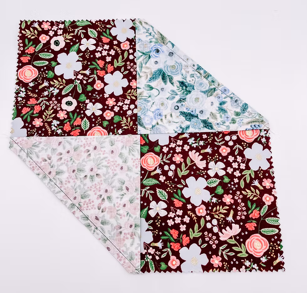 This is what inspired Elegante Virgule and I to create this pattern! She has this beautiful layer cake in her store, and she also has these beautiful Rifle Paper Co. fabrics in yardage as well. The final quilt I made measured 48″ x 48″, but you can easily make additional blocks to increase the final size of your quilt!