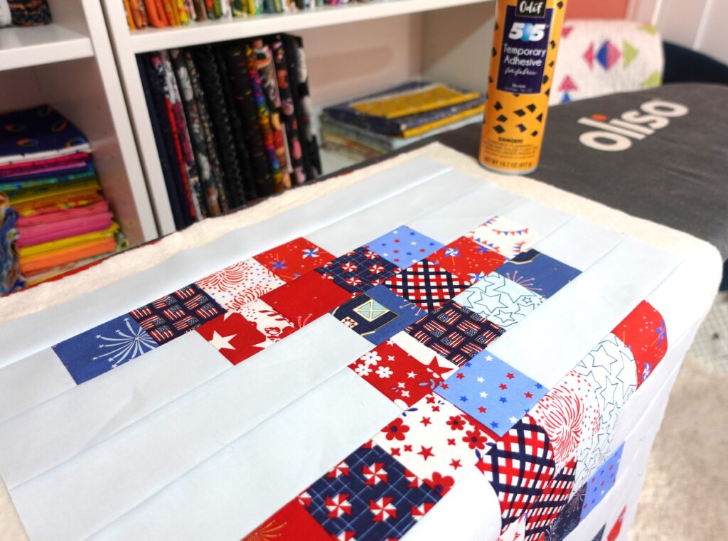 After the columns of squares are sewn together, it’s time to lay them out with the background pieces!