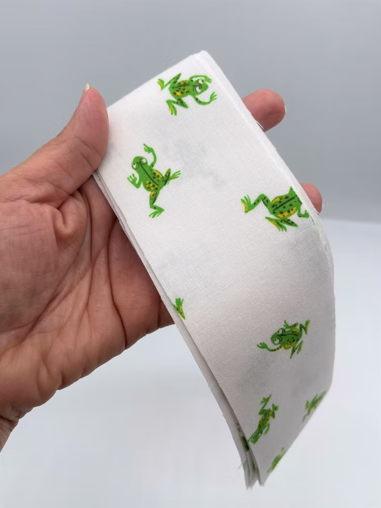 I am currently working on a Heather Ross by Windham Fabric baby quilt version of the Churn Butter Cookie Quilt and I picked this adorable Heather Ross frog fabric for my sashing and background. It is definitely adding a whimsical touch to this design!