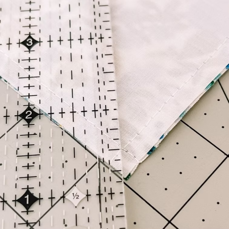 After your 1/4″ seam is sewn around all four sides of your square, lay your quilting ruler on the diagonal to intersect each sewn corner.